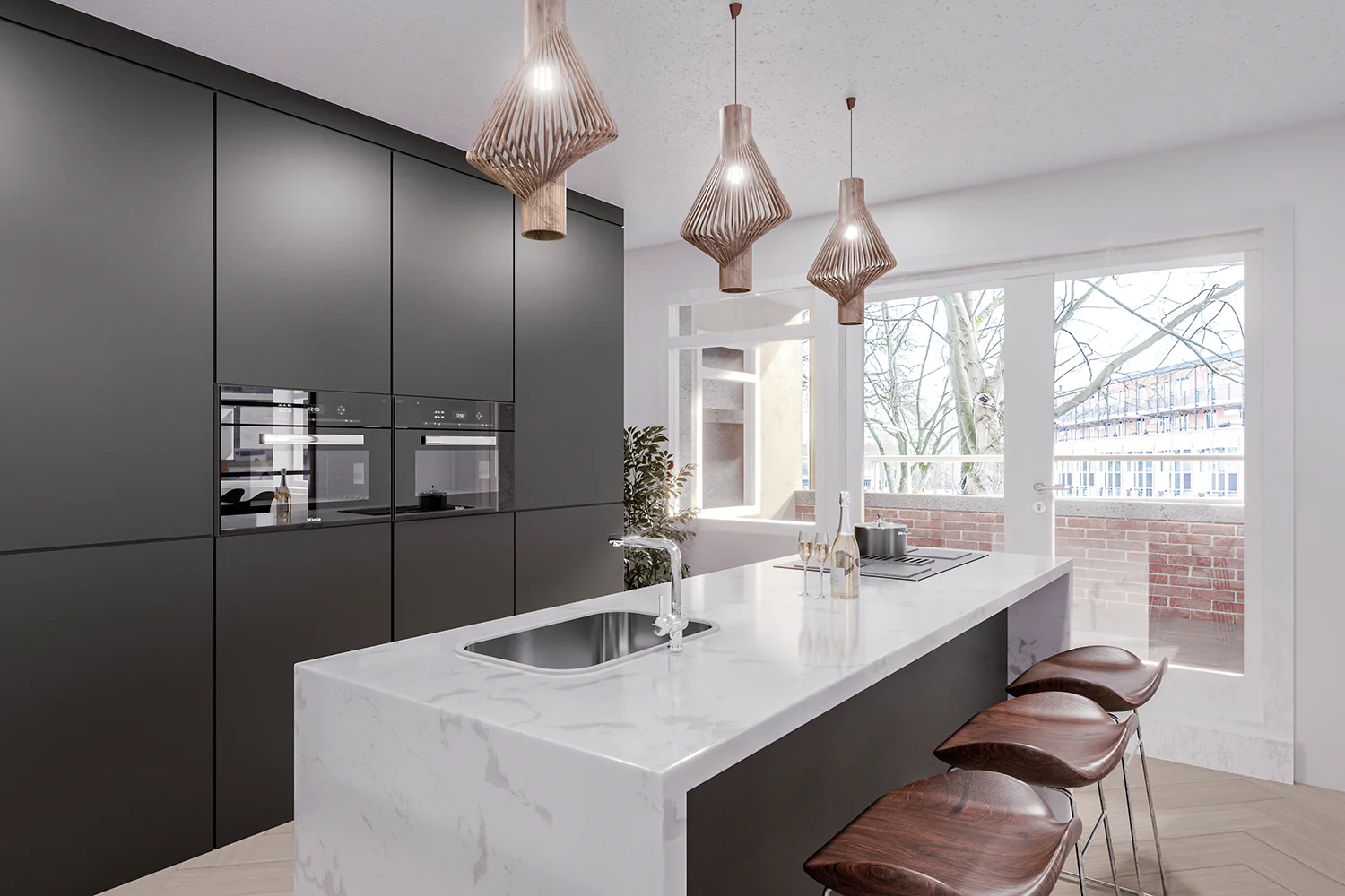 Voor velen is de keuken de favoriete plek van het huis. Het is de plek van eten en ontmoeting. Voor het (ver)bouwen van de keuken is het daarom belangrijk om de gewenste dynamiek in een 3D inrichting te visualiseren. Wil je graag een open keuken om met de woonkamer te verbinden? Of heb je liever een gescheiden keuken? Ontdek het met een 3D inrichting!